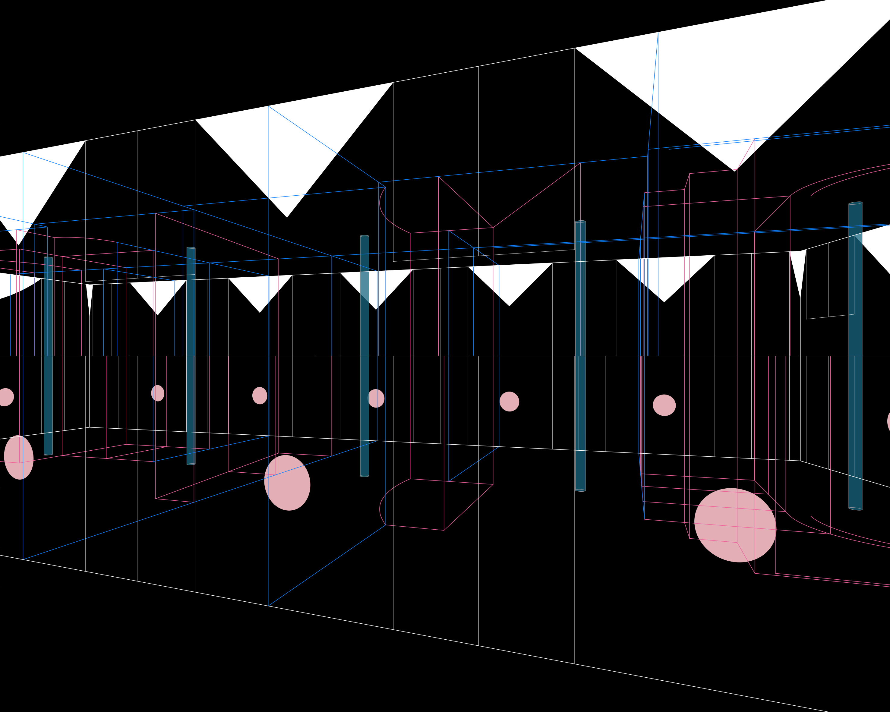 The selected drawings are fragile skeletons built out of lines and surfaces. Each belongs to a different project and a different moment in time: some finished, some under construction, others about to be built. They are snapshots reflecting on different aspects—interior perspectives, overlaid façades, bird’s-eye views of sorts. Printed on semi-transparent paper and mounted in light boxes, the drawings can be seen as if on a computer screen, where they somehow belong. The lamp highlights the white skeleton, the opaque hatches, activating both chaos and order. They are at once precise and surreal: very close to the idea of the project, yet quite far from actual building matter.