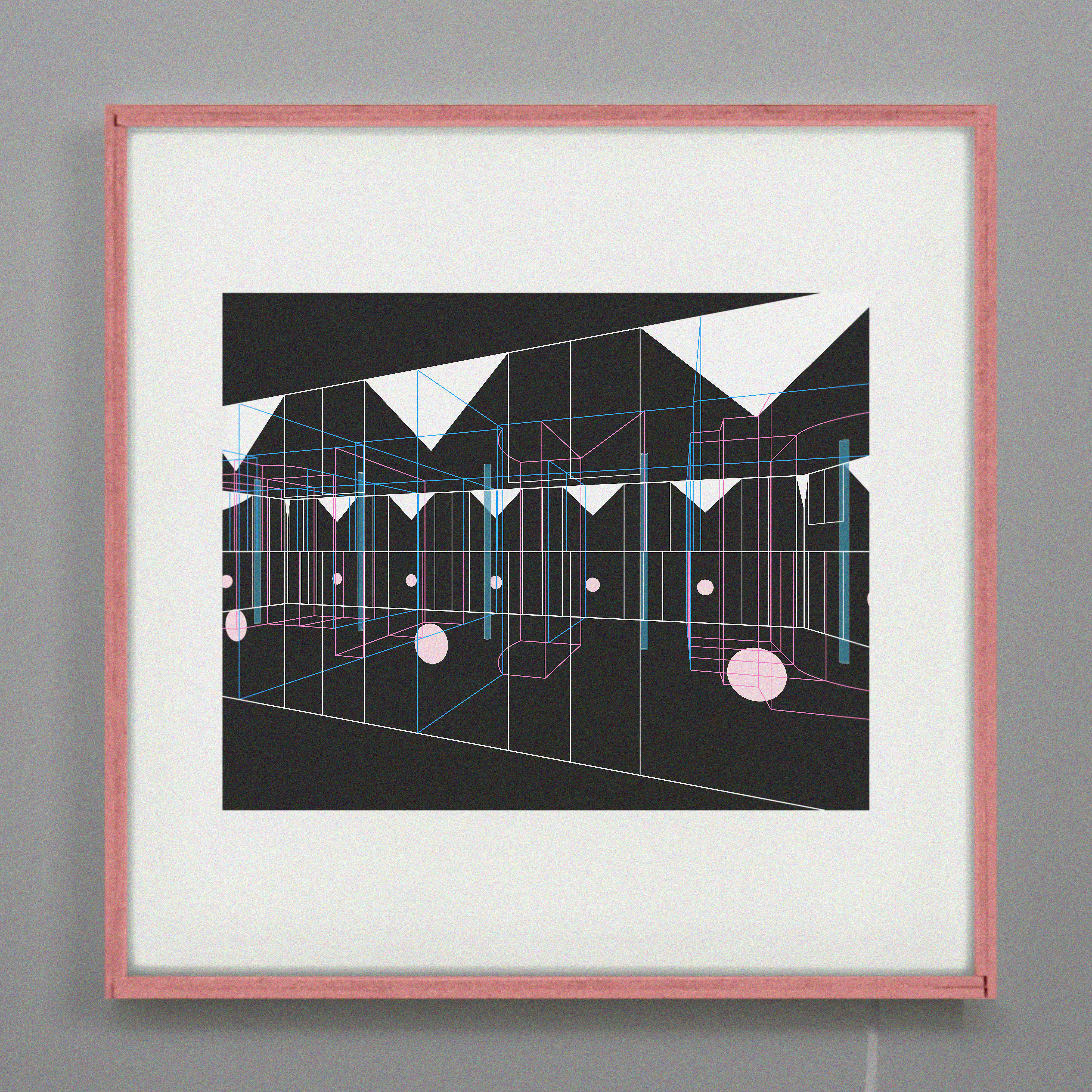 The selected drawings are fragile skeletons built out of lines and surfaces. Each belongs to a different project and a different moment in time: some finished, some under construction, others about to be built. They are snapshots reflecting on different aspects—interior perspectives, overlaid façades, bird’s-eye views of sorts. Printed on semi-transparent paper and mounted in light boxes, the drawings can be seen as if on a computer screen, where they somehow belong. The lamp highlights the white skeleton, the opaque hatches, activating both chaos and order. They are at once precise and surreal: very close to the idea of the project, yet quite far from actual building matter.
