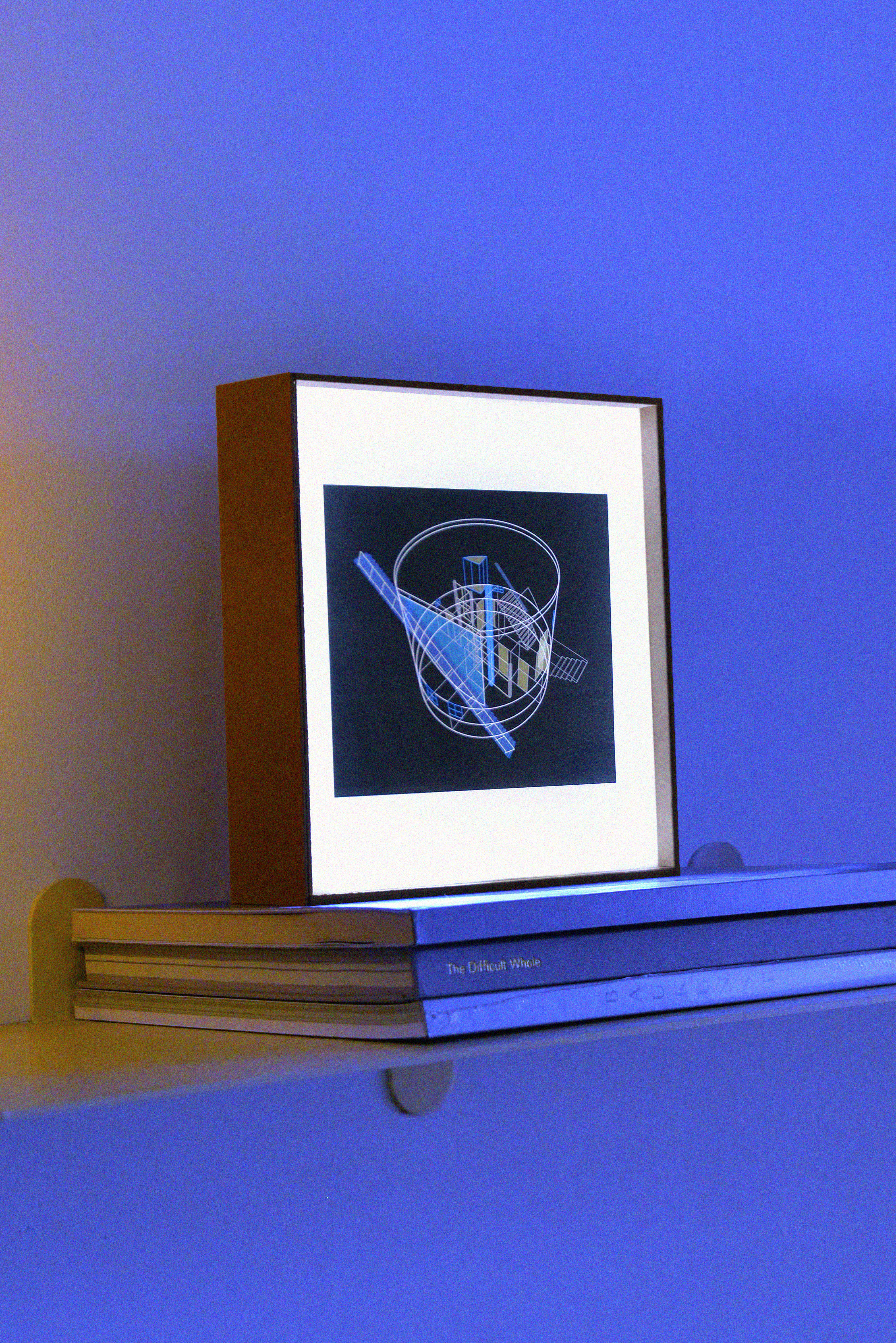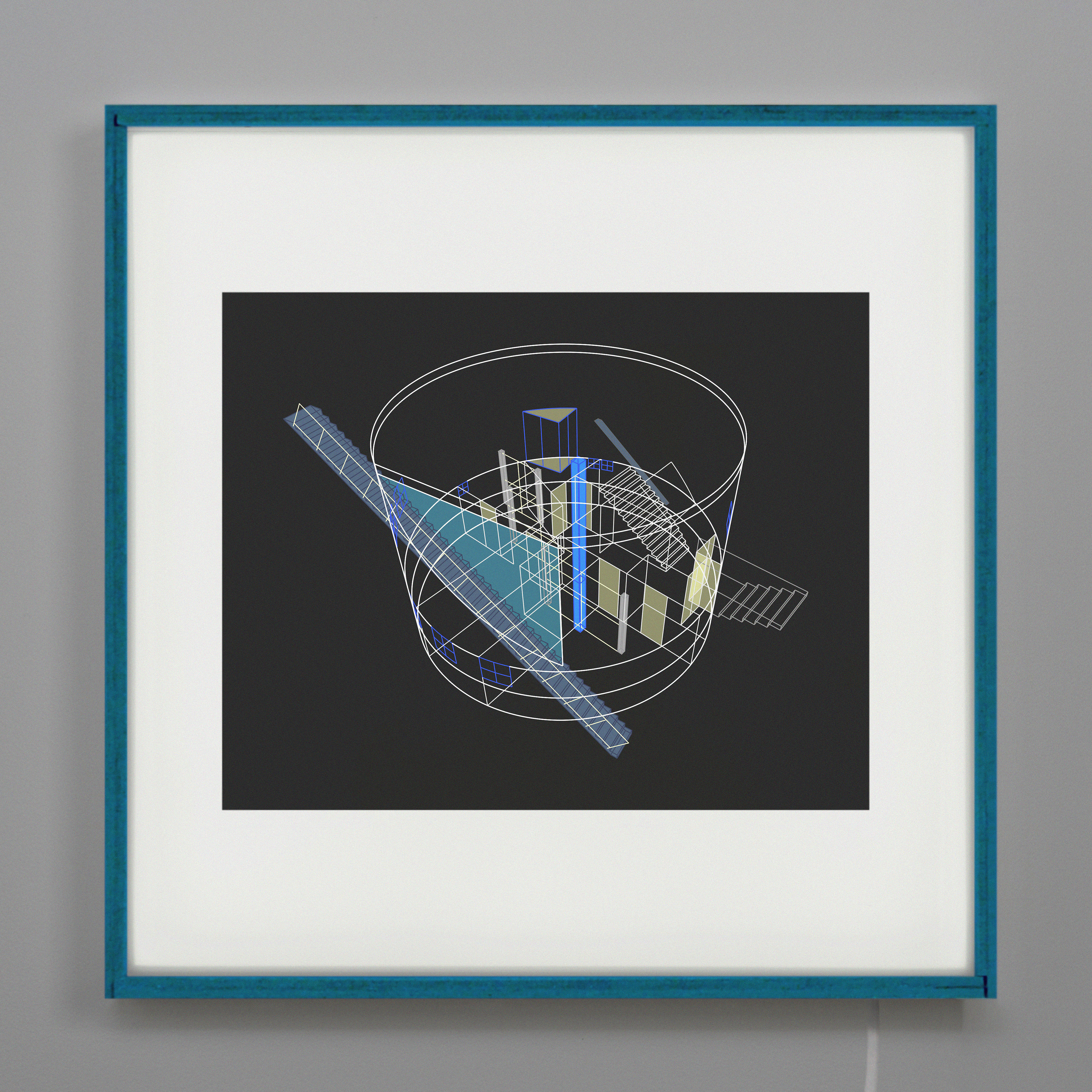 The selected drawings are fragile skeletons built out of lines and surfaces. Each belongs to a different project and a different moment in time: some finished, some under construction, others about to be built. They are snapshots reflecting on different aspects—interior perspectives, overlaid façades, bird’s-eye views of sorts. Printed on semi-transparent paper and mounted in light boxes, the drawings can be seen as if on a computer screen, where they somehow belong. The lamp highlights the white skeleton, the opaque hatches, activating both chaos and order. They are at once precise and surreal: very close to the idea of the project, yet quite far from actual building matter.